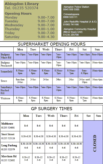 Abingdon in Focus has some useful telephone numbers, GP surgery times, library times and supermarket times. I like being able to compare such things in tables.