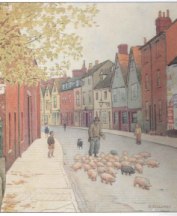 fresh, slightly naive, and humorous, and shows Abingdon through the 1930s and 40s". They show one print of Pigs in Broad Street. There are already postcards of some of these in the museum (Copyright Abingdon Town Council)