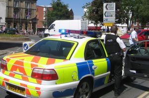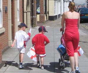 This mum is taking her three children, complete with flags, into Abingdon, on this sunny morning.