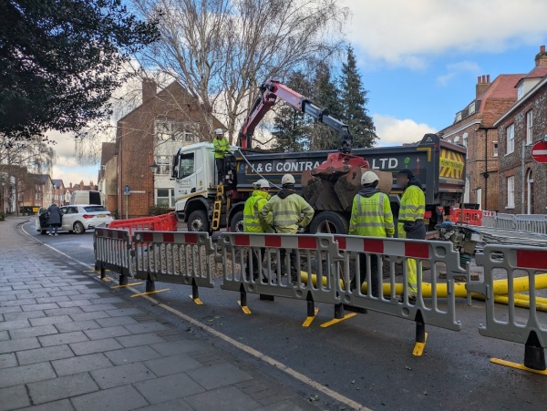 Meanwhile, the road by St Helen’s Wharf remains shut, but progress has been made: the new yellow plastic gas main has been laid, and the trenches have been backfilled. There are just a few inches left at the surface, waiting to be finished with tarmac.