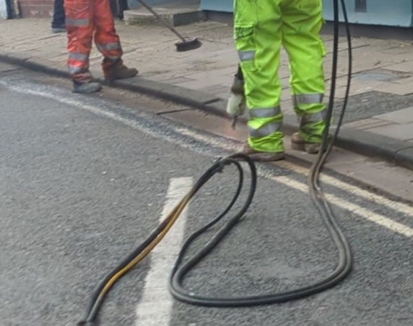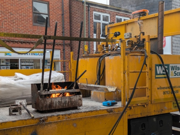 Old lines are removed by heating them to soften the material, then it is scraped away. The double yellow lines near the Co-op are being replaced with a 30-minute limited-waiting bay. Opposite, the parking outside the Salvation Army has been replaced by double yellow lines. These parking changes were agreed on 22 January by Oxfordshire County Council following an earlier consultation.
