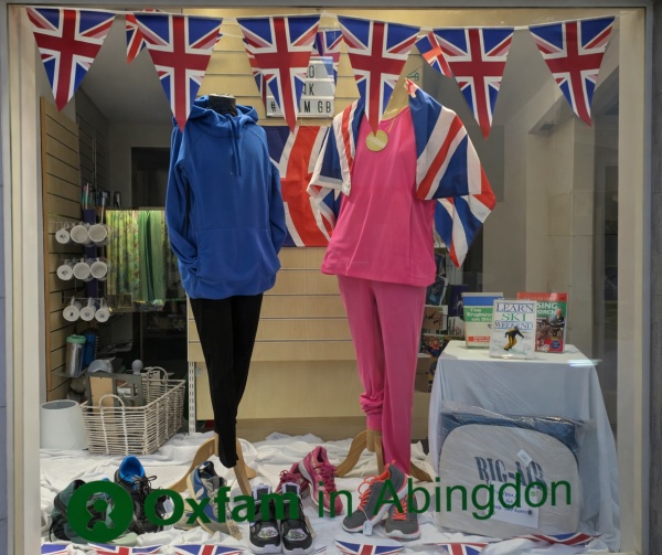 In the window of Oxfam – Bury Street, Abingdon, two mannequins framed by Union Jacks have been there throughout the Milano Cortina 2026 Winter Olympics. A light box says: GOOD LUCK TEAM GB. One mannequin has a gold medal.