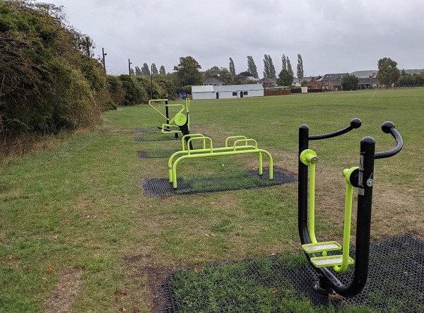 New exercise machines are on one side of the Caldecott Recreation Ground hedge.