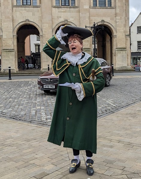 The Town Crier, Penny Clover, was on the Market Place, announcing that the Abingdon Beer Festival is on this weekend in the Abbey Buildings.