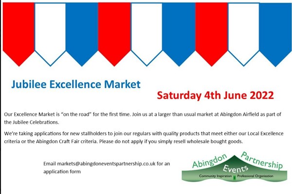 The team who organise the Local Excellence Market have been invited to take part in a large event at Abingdon Airfield on 4th June. The event will be a lot more than a market. See https://www.abingdoneventspartnership.co.uk/jubilee-market.