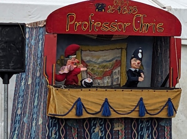 Mr. Punch’s insulting names for Judy, Rudy Doodie, and the Policeman, copper, always backfired. The audience enjoyed watching him get caught and scolded. Mr Punch also tried his hand at parenting, but his unawareness of a lurking green crocodile, he’s behind you, caused consternation and laughter.