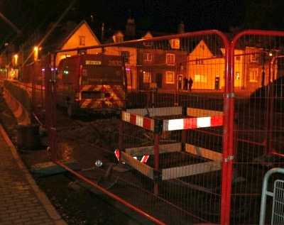 Arriving home this evening I was suprised to find that Stert Street was closed to traffic. The road has been seeping water for a couple of months, and work has started to fix it.