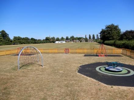 The grass looks parched alongside the black surrounds to some of the play equipment at Caldecott Recreation Ground.
