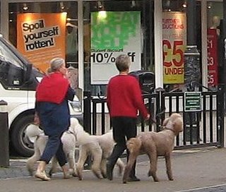 This picture was taken at about 6 AM. The caged van is there to pick up traders rubbish bags, and the ladies are out walking their poodles.