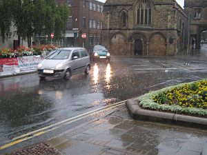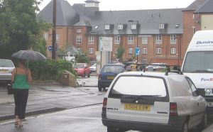The umbrellas were up. This is looking down St Edmunds Lane, across the West St Helen Street Carpark, to the brewery development.