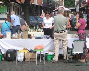 This shows people browsing their bric-a-brac stall. In the background is a Tombola.