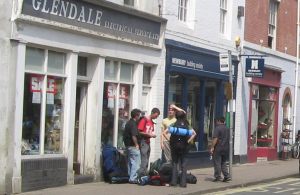 And here and there came visitors to Abingdon – people passing through on this Saturday – the first great migration of the school holidays. These teenagers with Ruck-sacks are outside Glendales on West St Helen Street.