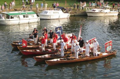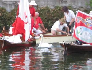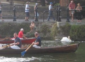 The traditional annual census of the swan population, The Swan Upping, took place during this sunny week. It finished this evening at about 6:30 at Abingdon Bridge. Here the boatmen brought all their boats together, and raised a glass “To the Queen.” They then went on to the Broad Face for a few beers, and the odd few songs.