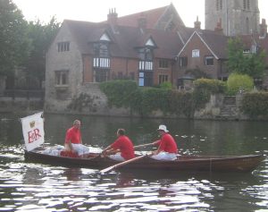 The boats then rowed through Abingdon. This is the Queens own boat with the ER motif.Fellows Court and St Helens Church can be seen in the background. For the first time in months St Helens is seen without scaffolding. The bells are installed, and the dedication service for the new bells will be led by the Bishop of Reading on Tuesday.