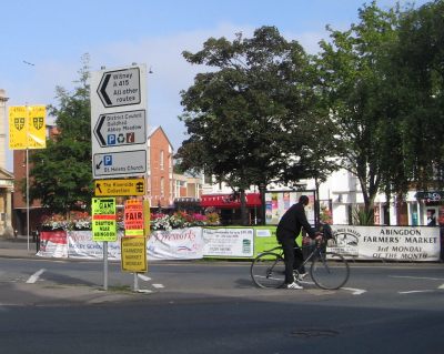 This cyclist has come to a halt. His attention has probably been taken by one of the banners or posters alongside the railings of the Market Place. Everything is competing for his attention. white banners, yellow posters, orange posters…