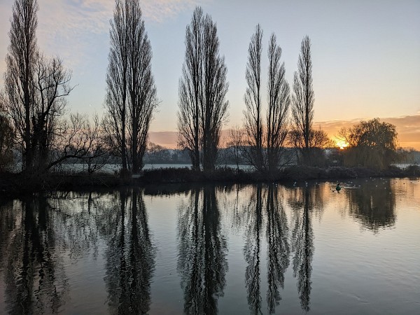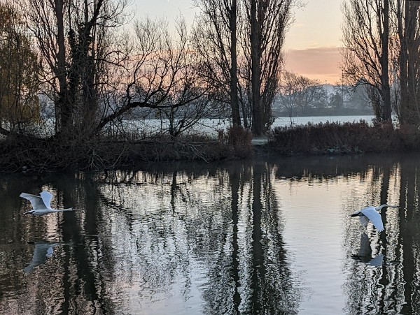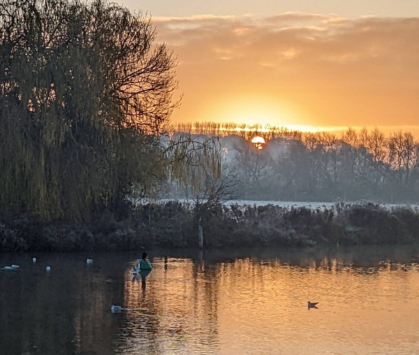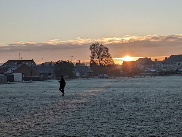 Hoar frost covered branches of trees, leaves, hedgerows and the grass blades at Caldecott Recreation Ground