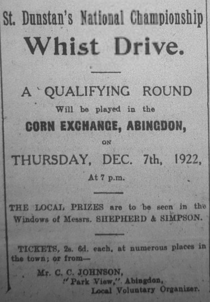 A whist drive in connection with St. Dunstan’s National Whist Championship was held on Thursday evening last in the Abingdon Corn Exchange when over 160 were present. The Mayoress presented the prizes to the winners as follows Ladies—Mrs F. Mott, Mrs Sheard. Mrs Easton, and Miss Carter. Men — Messrs E. F. Roberts. R. B. Pollard, junr, F. Wicks and P Strange.