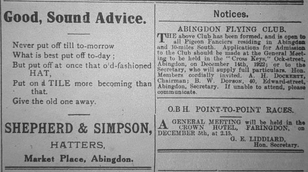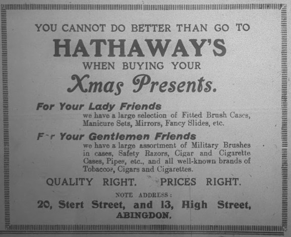 The Christmas festival in Abingdon was celebrated very quietly, and, as is usually the custom, it was the season of many family reunions. The weather on Saturday and Sunday was such as to hold out hope of a dry frosty Christmas. Vendors of holly and mistletoe did a good trade, and several holly wreaths were laid at the base of the war memorial. On Saturday, each family whose breadwinner was unemployed, received, from an anonymous friend, something extra in order to join in with the festival. Many celebrated Christmas Eve on Saturday night, and not a few converted Sunday into an extra Christmas Day. The bells of St Helens heralded the arrival of Monday and Christmas Day. The Three celebrations at St Helen’s church were well attended, as were those in other churches. The weather changed and rain set in, making Christmas Day a fireside one. At the cottage hospital, the few patients had an enjoyable time, whilst the isolation hospital had 172 patients. Thanks to the generosity of local people and the hard work of the matron and her staff, the day was enjoyed. Each patient received a present from the Christmas tree. ‘Christmas at the workhouse’ is an old saying, but its meaning has changed. Instead of being despised, Christmas is made as happy and enjoyable as possible for the old people and inmates. Festivities continued from Christmas Eve to Thursday and ended with a concert.