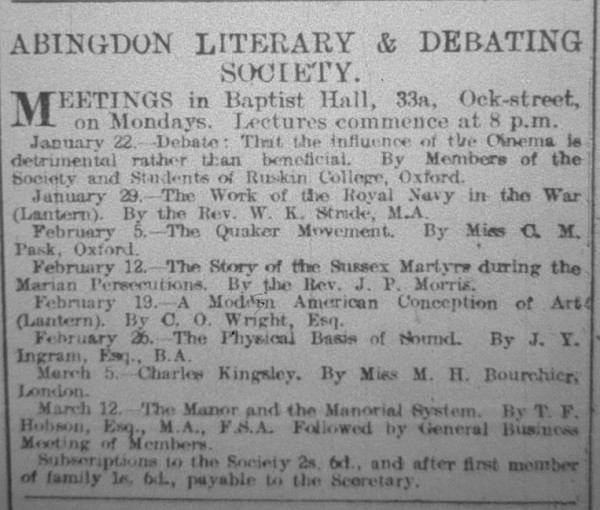 LITERARY AND DEBATING SOCIETY The Spring session of the above commences on Monday when a debate between members of the Society and Ruskin College on ‘whether the influence of the Cinema is beneficial or detrimental.’