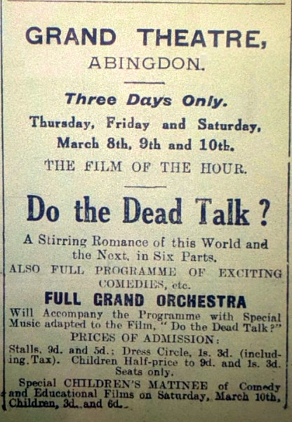 Do the dead talk? This film will be shown at the Grand Theatre Corn Exchange during the last three days of next week. It should prove a tremendous attraction since never before has such a story been seen on the screen, and it deals straightforwardly, neither for nor against this most discussed question of the day, with the possibility of communicating with the dead. It does not attempt to convert but to unfold in dramatic style, a story of mystic influences that affect human life patterns. It would be well advised to book seats early.