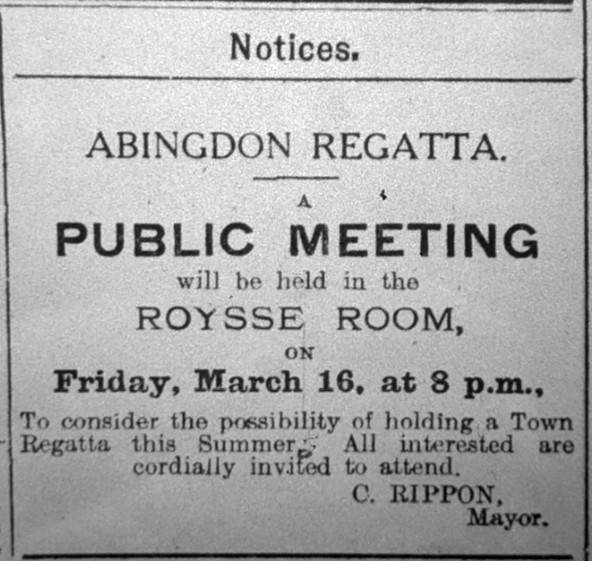 The Mayor has, at the request of a number of burgesses, convened a public meeting in the Roysse room for Friday evening to look at the question of reviving the Abingdon Regatta this summer. All interested, especially the members and committee of the old Skiff Regatta, are invited to attend.
