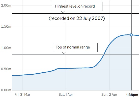 There had been a dramatic rise in water levels overnight, which peaked at around noon. (Thanks to the EA monitoring station https://check-for-flooding.service.gov.uk/station/7081).