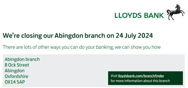 Lloyds Bank has announced the closure of its Abingdon branch on 8 Ock Street. The closure is scheduled for July 24th, 2024.