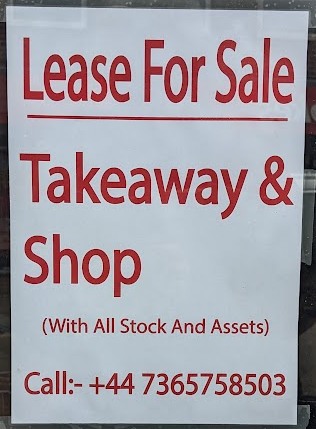 There’s a sign that says ‘Lease For Sale: Takeaway & Shop (With all Stock and Assets).’ It seems like they had to give up for some reason. So that’s sad.