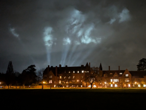 Laser lights from the Abingdon Bonfire & Fireworks 2025 at Dalton Barracks were visible behind Abingdon School.