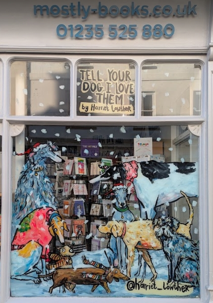 At Mostly Books, on Stert Street, snow is falling. Their window features a painted scene celebrating ‘Tell Your Dog I Love Them’, created by the book’s own author-illustrator, Harriet Lowther who will be there on December 6th. Mostly Books often invite artists to create street art in their window. I wonder whether they ever replace the glass and sell the originals like Banksy’s.
