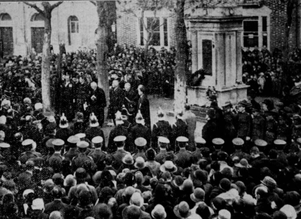 The Last Post was sounded, followed immediately by the Pavlova Works hooter signalling the start of the Great Silence at 11 a.m. Afterward, Reveille was played by Bugler Webb of the Wantage Contingent, 4th Battalion Royal Berks Regiment. Children from the elementary schools sang Sir Esme Howard’s setting of John of Gaunt’s speech from Richard II.
