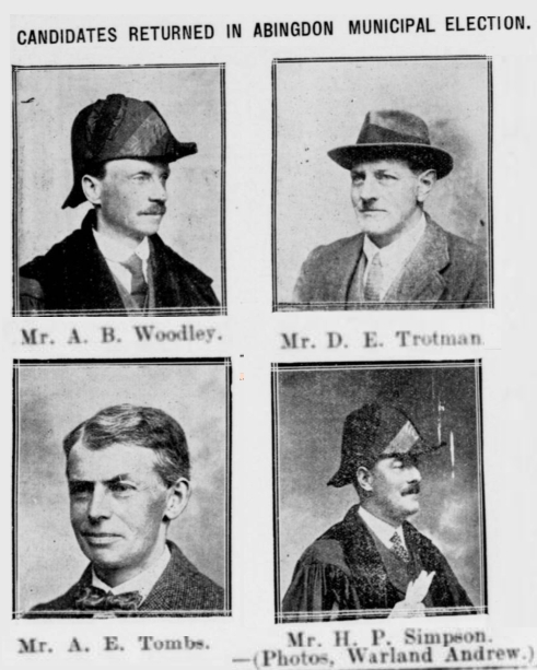 Abingdon elected four councillors on Monday, with 2,074 of the 3,066 electorate turning out. During the day a sandwich man and a perambulator toured the town urging voters to choose ‘the straightest, the truest, the best,’ while in the evening children’s bands marched through the streets, their competing shouts sparking jeers and counter-jeers from other bands.