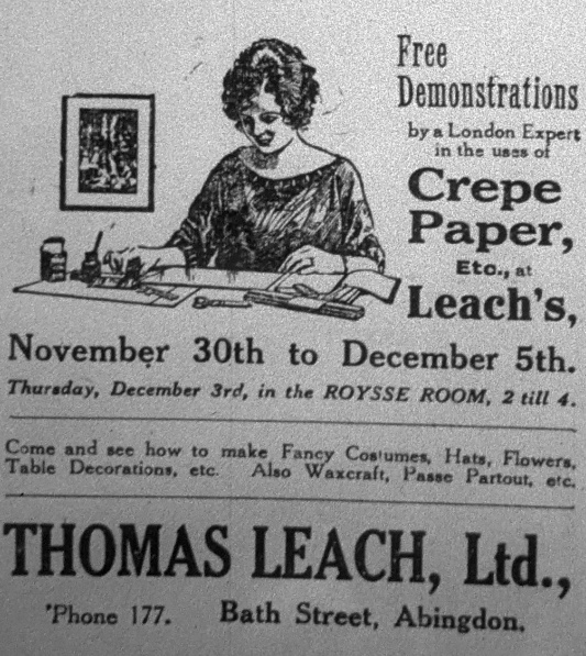 An arts and crafts demonstration featuring an expert from London will be held next week at Messrs. Leach’s shop on Bath Street, Abingdon. The free event will show how to make a variety of items using crepe paper and sealing-wax, including costumes, lamp-shades, flowers, hats, and table decorations. It runs daily from 10 a.m. to 5 p.m., with an additional session on Thursday from 2–4 p.m. in Royce’s Room. With Christmas approaching, it’s expected to be popular among local residents.