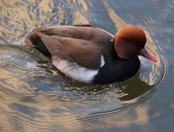 The display is appreciated by people walking the wharf. Even the river seems to have gained a festive visitor. Among the familiar mallards, a new duck has been seen in recent months: a Red-crested Pochard. It behaves much like the others, paddling over hopefully when people stop and gaze. These exotic birds were originally part of ornamental bird collections, and have escaped and gone native.