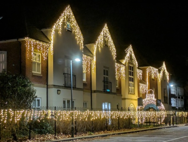 From the Waitrose car park, Bridge House is surrounded with lights, including a walk-in bauble at the Riverly Club entrance and other installations round the side.