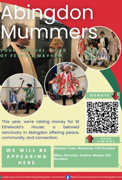 The Abingdon Traditional Mummers will be touring the villages of Milton, Steventon, and Drayton (Monday 15 December evening), and around the pubs of Abingdon town centre ( Wednesday 17 December evening). This traditional folk play shows the struggle of good against evil with sword fighting and healing and ends with We Wish you a Merry Christmas and rattling of the donation tin. Donations support St Ethelwold’s House.