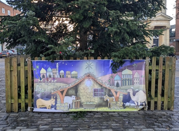 Members of the Church in Abingdon were singing carols in the Market Place today. They set up banners, including one of the stable scene in the Nativity Story. There was a craft table and face painting.