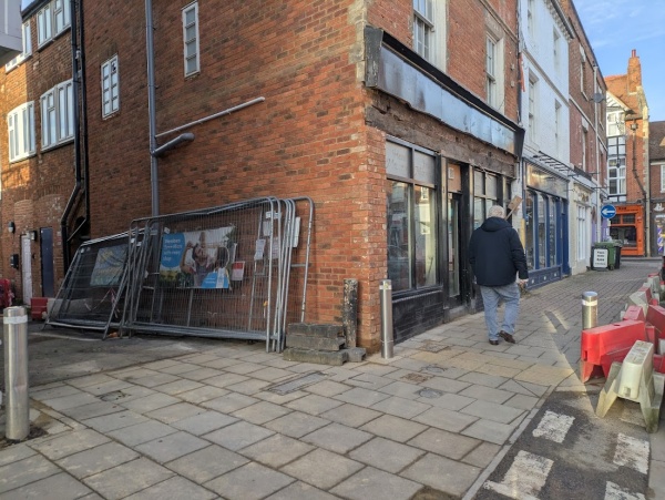 At the top of West St Helen Street, the barriers have now been removed. Pedestrians can once again use the pavement on the left when heading up to High Street, and the alleyway leading down to the back of the Grapes pub, and the rear of other properties, is open again.