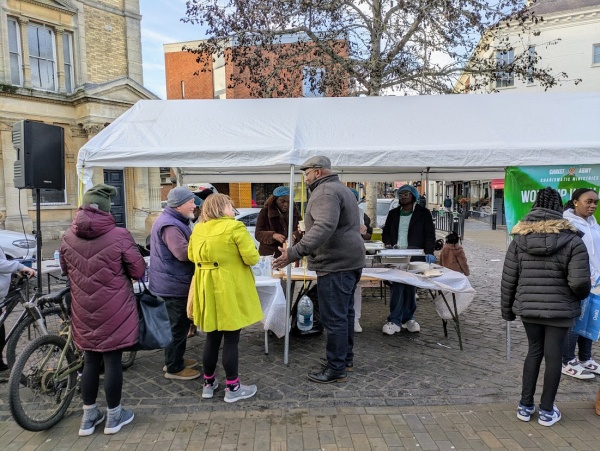 On the Market Place, members of the Christ Army Charismatic Ministries were offering food to people passing by — rice and peas and spices, chicken and salad. One young woman explained that they were also there to share the ‘good news’. The group meets at Larkmead School and grew from a small gathering that began near Dalton Barracks. They now serve food and offer to pray for people in the town as part of their outreach activities four times a year.