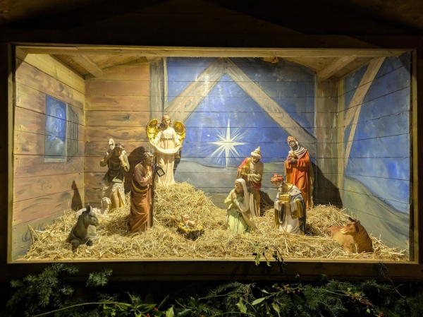 There is a Nativity tableau outside St Edmund’s Church in Abingdon. Lit up at night and visible during the day, it shows a traditional scene in a wooden stable: Mary and Joseph with the baby Jesus in a manger, watched over by an angel, with shepherds, the three wise men, and animals, with a painted night sky and an enormous star.