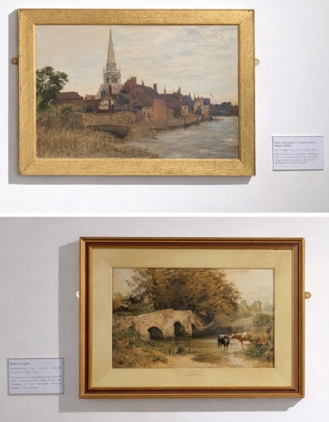 At present, two new painting are displayed side by side in the Attic of Abingdon County Hall Museum. Both now belong to the museum. One was a gift from Sint-Niklaas to the Abingdon Church Twinning Group who, after displaying it themselves at churches, donated it to the museum. That is Study of St Helen’s Church and St Helen’s Wharf by George Vicat Cole.