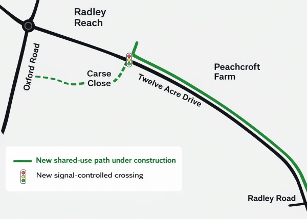 A new shared-use path is taking shape along the north side of Twelve Acre Drive as part of the wider North Abingdon development. When complete, it should provide a useful route for people walking or cycling towards Radley Station.