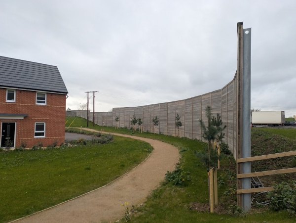 The Abbey Fields housing development is much closer to the A34 than previous estates, and a long and, in places, high fence has been installed to reduce noise from the 70 mph dual carriageway.