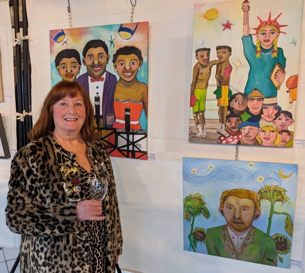 This month’s featured artist is Valerie Dearlove, who describes herself as a self-taught “primitive” or “outsider” artist working in oil on canvas. Her style is direct and colurful, unconcerned with formal conventions. Above are some of her paintings at an Abingdon Artists exhibition.