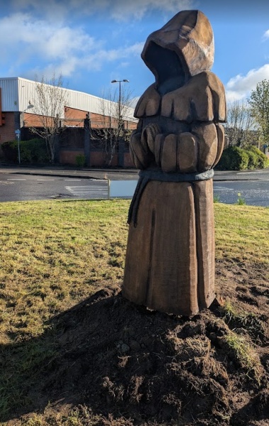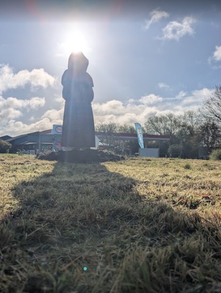 Despite what this blog reported on April 1st, the monk has really appeared on the Marcham Road Roundabout this Easter Day morning – as a big surprise.