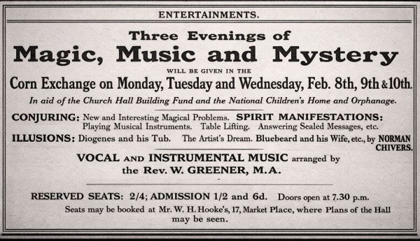 The final section consisted of so-called spirit manifestations. Before commencing this part of the entertainment, Mr Chivers informed the audience that everything would be accomplished by sheer trickery. Nevertheless, features such as “The Dancing Table” aroused considerable interest and provided a striking conclusion to the evening.